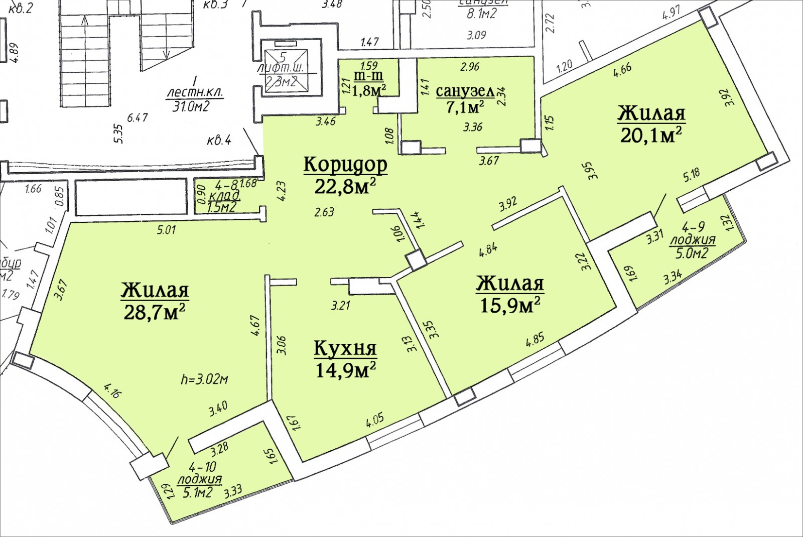 Высота потолков составляет 3 метра. Две комнаты оснащены лоджиями. Одна из них, которую можно использовать как гостиную или кабинет, также имеет нестандартное обзорное окно.